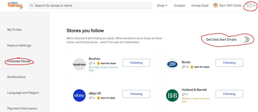 Above this is a list of the stores i follow on honey, you can access this by clicking the profile icon on top right side of screen that is pictured circled in red in the picture above then click on ” followed stores ” also circled in red on left side of screen, this will show you who you follow. You can see another red circled are ” get deal alert emails ” i have mine turned off just now as I follow a lot of sites and don’t want too many emails in my inbox. Honey applies coupons automatically at checkouts anyway so I can still shop and checkout without ever having to come onto the official honey website.