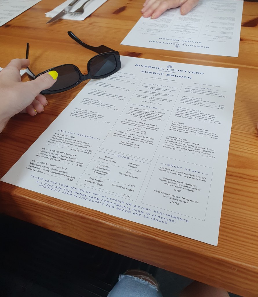 You can get a full vegan breakfast or a full Scottish breakfast. Chicken burgers or beef burgers and plenty of sides such as scrambled eggs, mushrooms and avocado and much more. They do have things containing nuts on the menu so watch out! All the eggs that riverhill serve are free range from corriemains farm in ayrshire, respect !