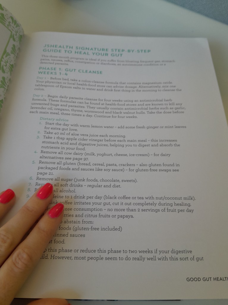 People with digestive issues will experience low moods as our serotine ( feel good hormone ) is made in our gut ! Also leaky gut syndrome which is caused my gaps in the gut lining can make food escape into our bloodstream activating an immune response, such as gas, bloating, general unwell feeling. Our gut needs to be detoxed and cleaned out to function optimally. Thinking of this I better get a plan in place… its going to be really hard to go through a detox process but reading books like this motivate me further and I hope you reading this become inspired to change also.