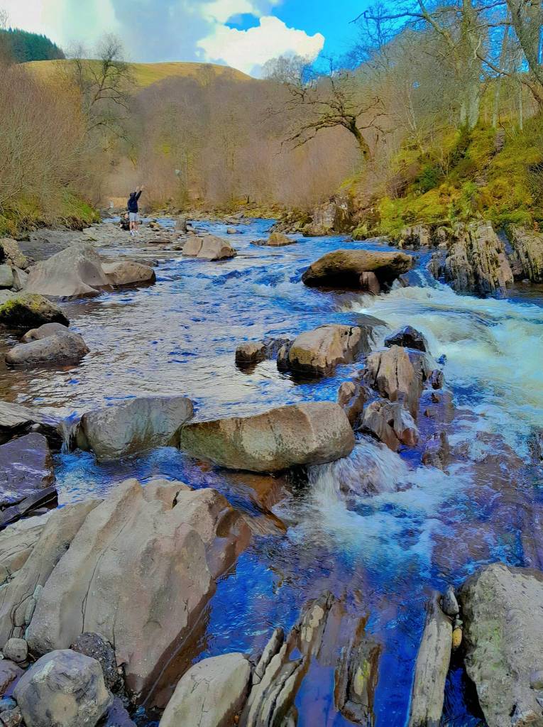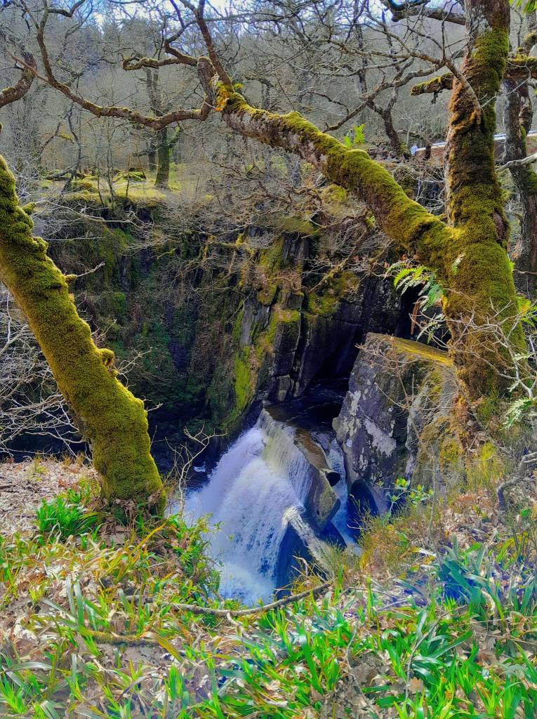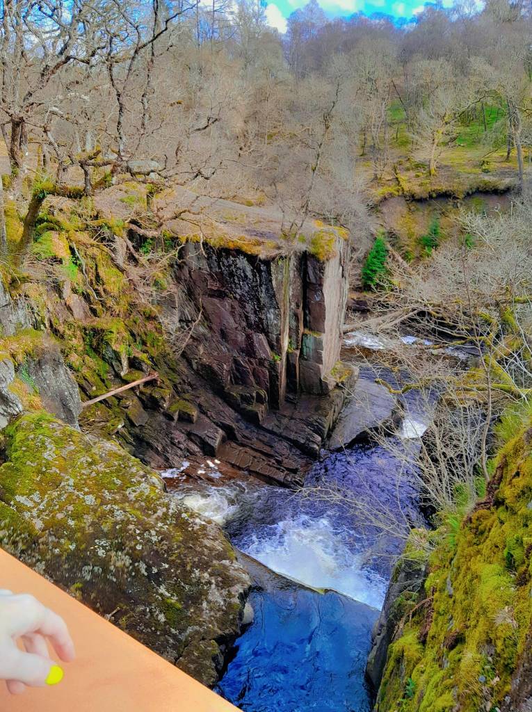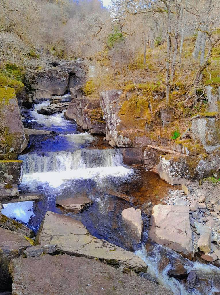 Bracklinn Falls is a series of waterfalls north-east of Callander, Scotland, on the course of the Keltie Water where it crosses the Highland Boundary Fault. The falls are situated in a beautiful wooded gorge and are one of the most spectacular waterfalls in Scotland. They have been visited by Queen Victoria and are especially impressive after heavy rainfall. Visitors can admire the falls from a viewpoint bridge suspended above the cascade. The falls can be reached with an easy walk from a car park close to Callander.